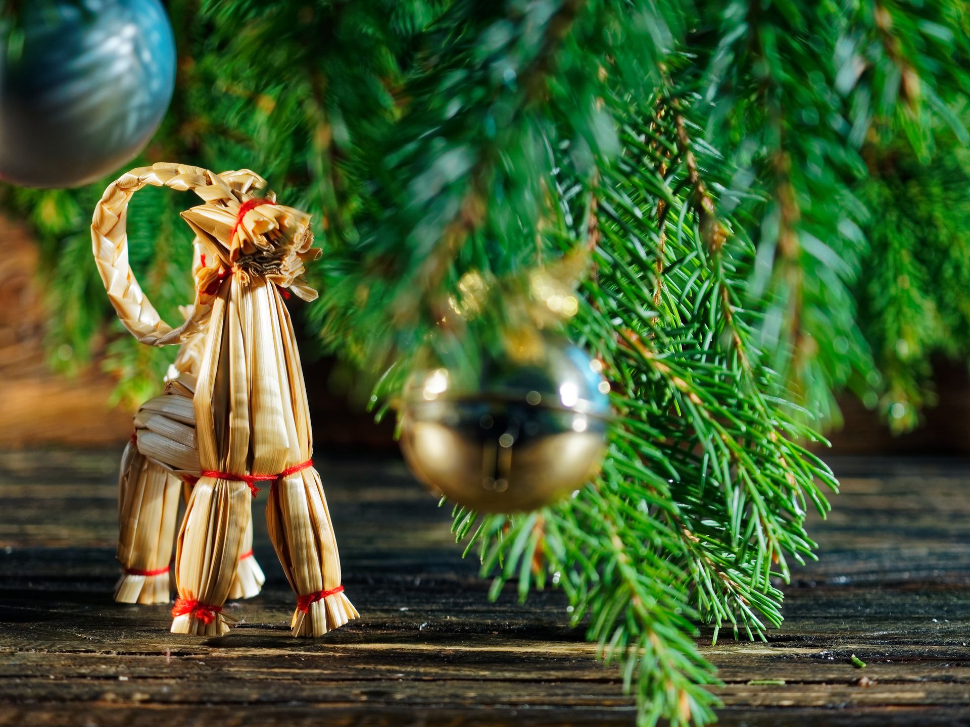 Aux côtés des bûches de chêne, les chèvres sont aussi une figure traditionnelle associée à Yule. Elles évoquent les deux bêtes attelées au chariot de Thor, le dieu du tonnerre : Tanngnjost « qui fait grincer des dents » et Tanngrisner « qui montre ses dents » (des noms qui en disent long sur leur charme !). Lors d’un banquet, elles auraient été mangées, recrachées puis ressuscitées par le dieu, puis finalement choisies pour le conduire dans le ciel. On les associe donc à une forme sans fin de nourriture, au cycle de la renaissance, ainsi qu’à la fertilité des sols découlant de la pluie apportée par la divinité. Les Julbock (« chèvre de Yule ») en paille sont aujourd’hui encore omniprésentes dans les décorations de Noël en Scandinavie. Un spécimen géant de près de 13 mètres de haut est érigé tous les ans dans la ville suédoise de Gävle, et en général incendié avant son démontage par de jeunes plaisantins.