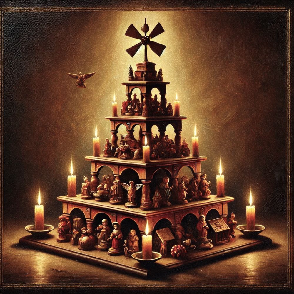 L’objet voit le jour vers le XVe siècle, dans la région des monts Métallifères (Erzebirge), zone frontalière entre la Saxe et la Bohème. Les habitants, vivant principalement de l’exploitation des mines, se prêtent à la sculpture du bois durant les périodes de fermeture. Les pyramides sont d’abord fabriquées à petite échelle pour décorer les intérieurs, avant de devenir un artisanat à part entière. L’arrivée de la paraffine, moins coûteuse que les combustibles utilisés jusqu’à présent, participe à sa démocratisation dans les foyers. C’est en 1926 que Traugott Pollmer, un habitant de Frohnau, propose d’ériger une grande pyramide pour tous. Le sculpteur Paul Schneider réalise alors une construction de 5 mètres de hauteur, avec quatre étages, de nombreux personnages peints et des illuminations électriques.