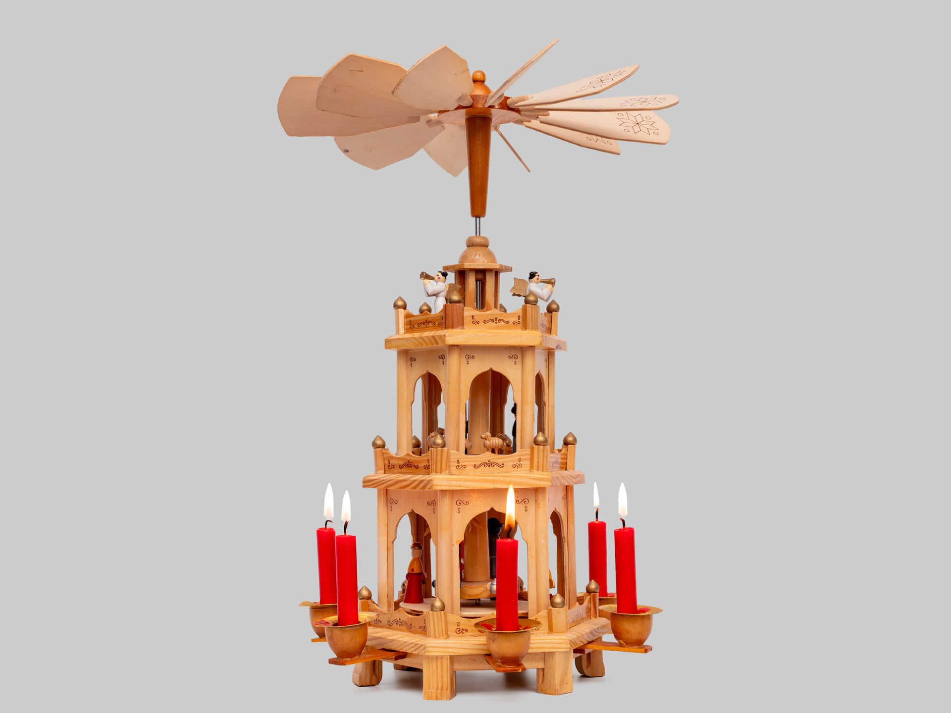 La pyramide de Noël est une structure de bois plus ou moins complexe, composée de plusieurs étages. Ils se rétrécissent petit à petit (oui, le principe d’une pyramide, nous direz-vous) et accueillent de nombreuses figurines chrétiennes ou profanes. Des bougies sont placées autour des niveaux. La chaleur dégagée par leur combustion fait tourner l’hélice située au sommet, qui entraîne les plateaux et les figurines dans une ronde festive.