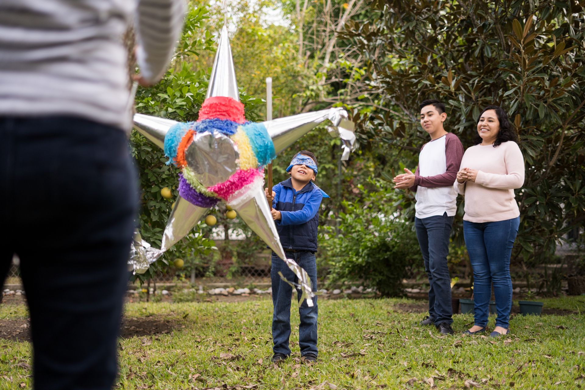 Enfant s'apprêtant à détruire une piñata de Noël sous les encouragements de sa famille, Mexique | aldomurillo / E+ via Getty Images
