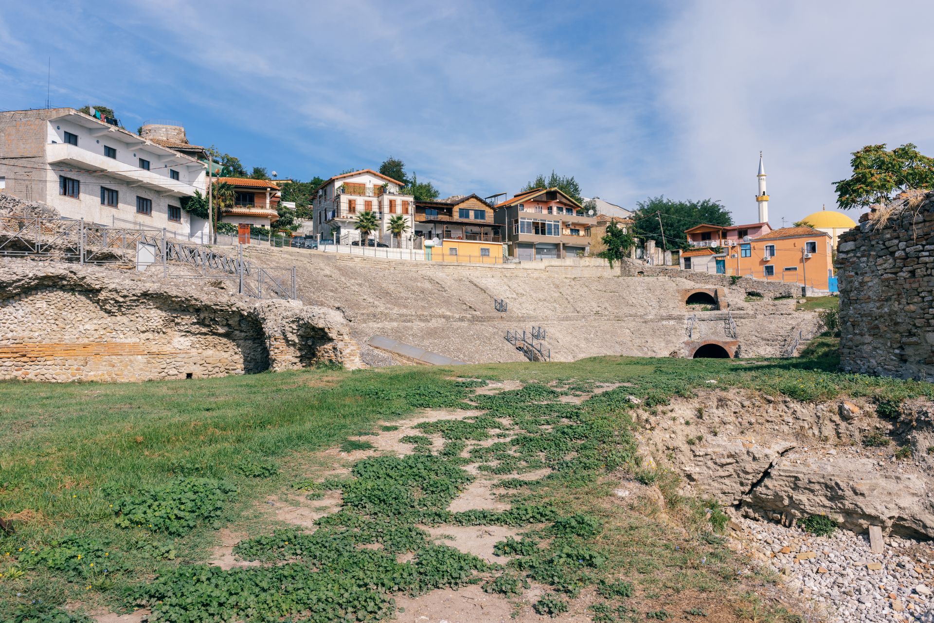 L’actuelle ville de Durrës, sur la côte adriatique, repose sur les fondations de l’antique Dyrrachium, fondée par les Grecs au VIIe siècle av. J.-C. et devenue une ville romaine prospère. Le principal monument visible est un amphithéâtre du IIe siècle, le plus grand des Balkans, partiellement enfoui sous les habitations modernes. Des mosaïques, une basilique paléochrétienne et des vestiges des remparts témoignent également de son passé prestigieux. Le contraste entre les ruines antiques et la ville contemporaine renforce le sentiment d’un passé toujours présent.
