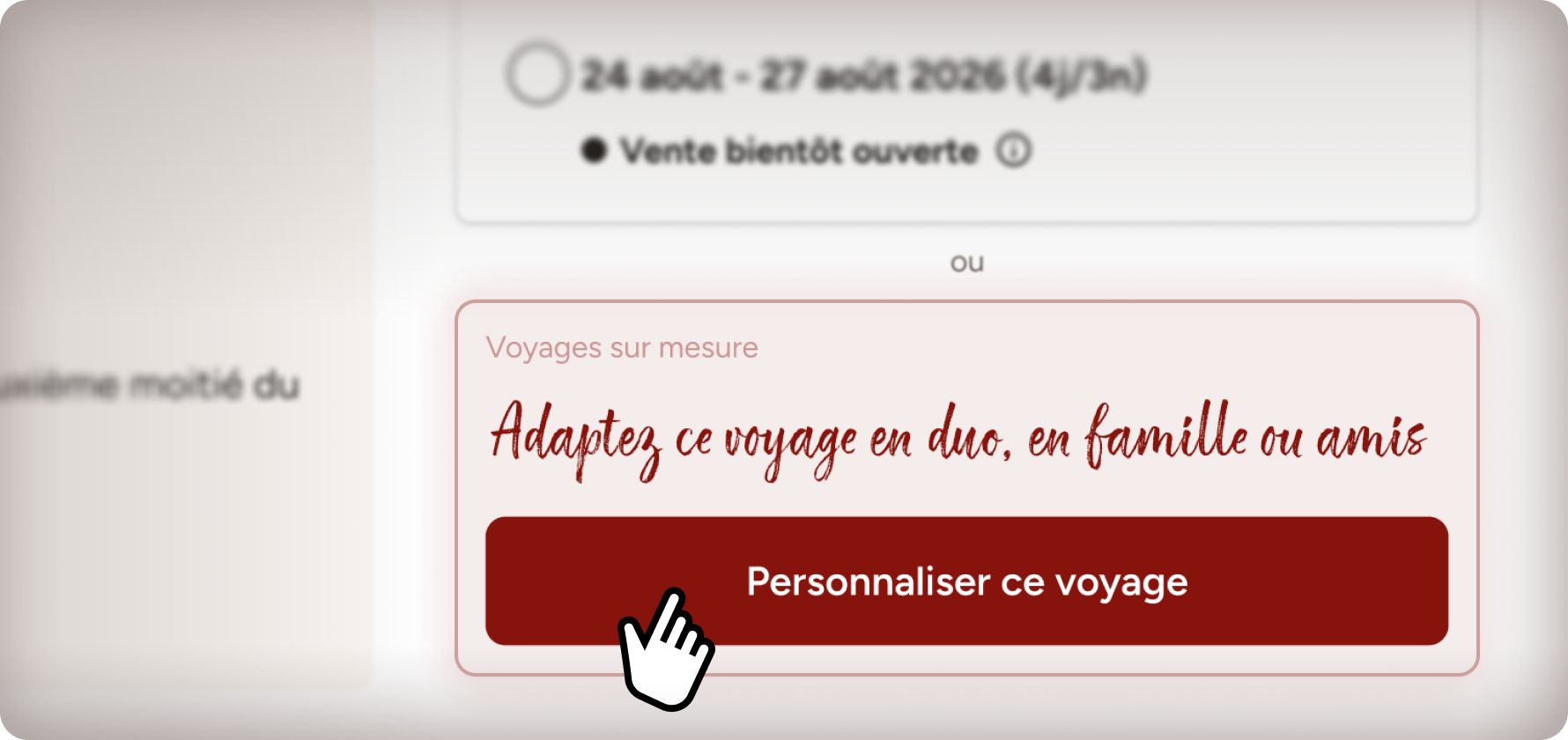 Depuis chaque page de destination, vous avez la possibilité de faire une demande de voyage privatisé, taillée selon vos envies : un rythme qui vous ressemble, des expériences qui vous touchent, des lieux choisis pour résonner avec votre histoire.